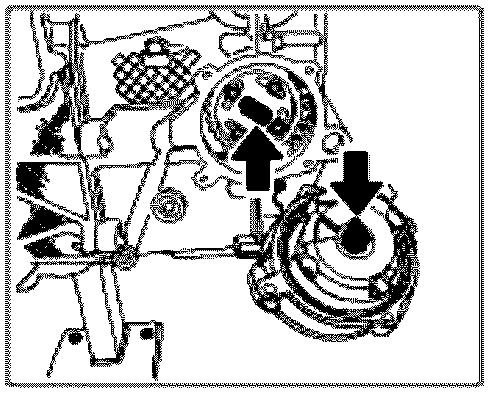 44. Remove tandem pump by unscrewing the four Torx screws (M6 x 30) -arrows-. During installation, note the position of the pump drive with respect to the groove on the camshaft sprocket. Both parts must be in line in the installation position. Otherwise the pump drive must be rotated. Replace O-ring and screws during installation.