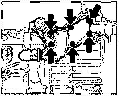 Remove water pump by unscrewing the six hexagon-head bolts (M6 x 25, M6 x 30) -arrows-. Replace metal seal during installation.