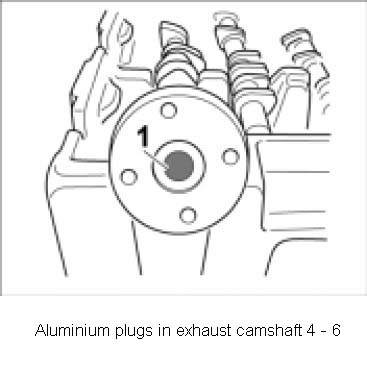 Additional identifying feature for exhaust camshaft 4 - 6: Aluminum plugs with lubrication bore -1- for tandem pump
