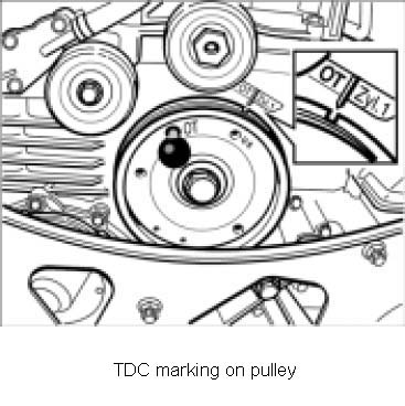 ^ Position crankshaft above the pulley or vibration balancer before final adjustment of the timing to the TDC marking.