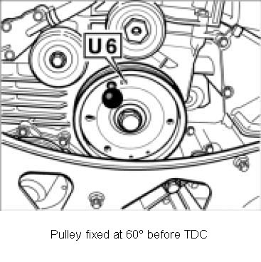 1. To remove the play from the timing chain drive, turn the crankshaft by means of the pulley or vibration balancer clockwise (running direction of engine to 60° before TDC : marking U6 on pulley or vibration balancer coincides with fixing bore in crankcase. Fix with locating pin 9595/1.