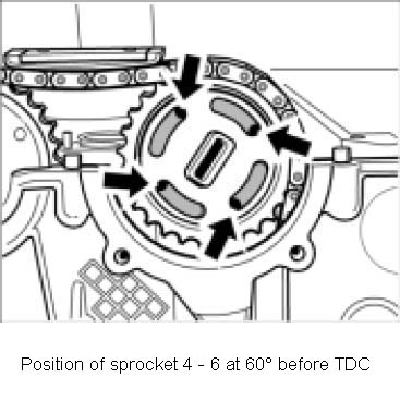 17. Insert four Torx screws M6 to sprocket of exhaust camshaft and tighten evenly in diagonally opposite sequence. Tightening torque: 10.5 ft lb.