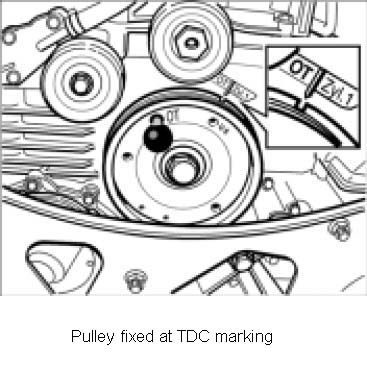 2. Disassembling cylinder bank 1 - 3 Turn crankshaft at the pulley/vibration balancer clockwise to the overlapping TDC of cylinder 1. Disassembling cylinder bank 4 -6 Turn crankshaft to the TDC for cylinder 4. Using a locating pin 9595/1 fix the pulley or vibration balancer .