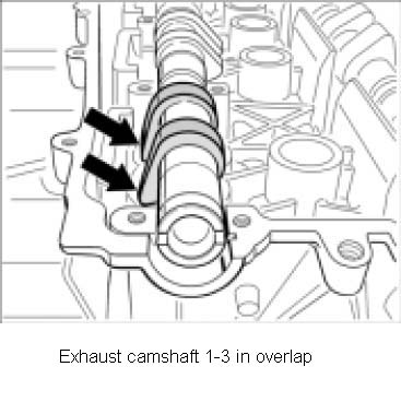 6. Insert exhaust camshaft 4-6. Lay the timing chain on the flange for the sprocket, then insert the camshaft at overlapping TDC of cylinder 4 (the outlet cams of cylinder 4 point towards the cams of the inlet camshaft -arrows-).