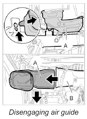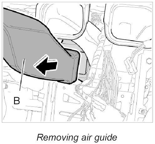 2. Pull the air guide -B- up out of the heater/air-conditioning unit.