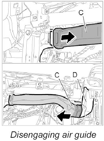 3. Disengage air guide -D- by pulling it upward at the mounting bracket, and pull it out in a downward direction to remove it.