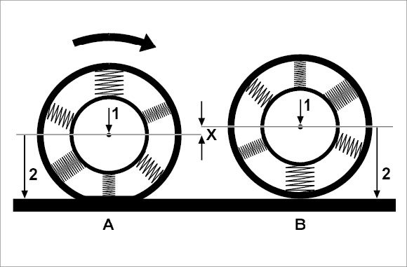 The radial force is a force that compresses a tire. Based on its size, a tire has softer (-item A-) and more rigid areas (-item B-) due to design and production-related factors. Given this, the tire compresses to various extents at a constant wheel load (-arrows 1-) and a constant tire pressure (-arrows 2-). This varying spring action -X- in the tire can cause vibrations in the chassis on even road surfaces and the driver may notice this as shaking in the steering wheel, for example. Measuring the radial force variation involves running the tire on a wheel balancer that measures radial force variation while applying a constant load to the tire. This simulates the rolling of the tire on a driving surface. Variations in radial force occur independently of the direction of rotation of the tire and are measured as the difference between the maximum and minimum radial force ("peak to peak" value).
