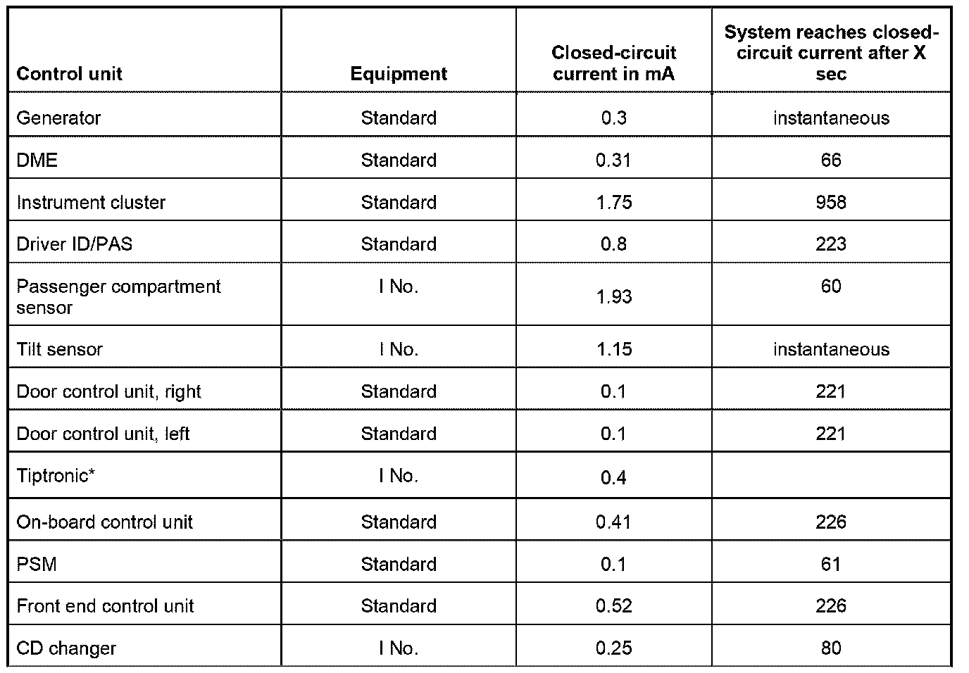 INFORMATION: Before measuring the closed-circuit current, determine the vehicle equipment (I numbers) and establish the expected closed-circuit current with the aid of the attached table.