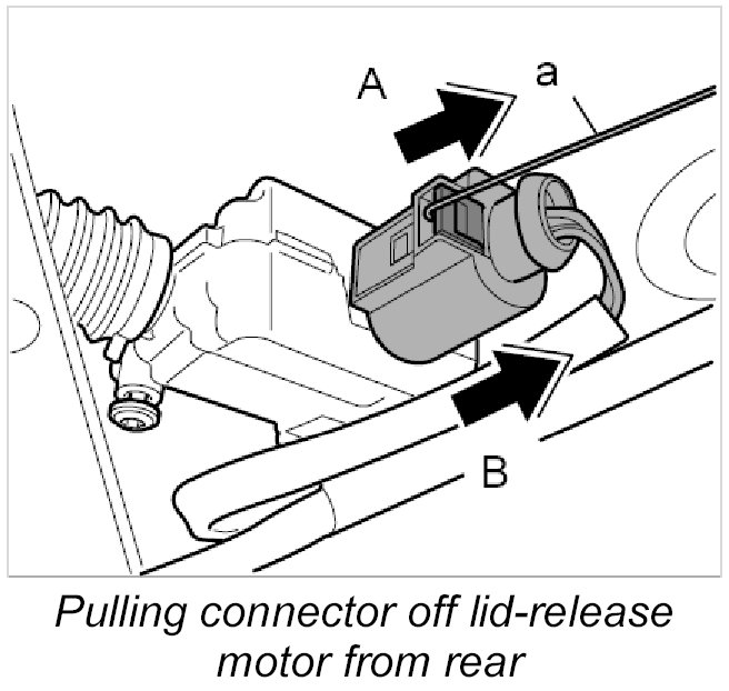1.1. Release connector on motor for lid-release with suitable auxiliary materials (e.g. angled piece of wire with diameter of approx. 1mm) -a- -arrow A- and pull off -arrow B-.