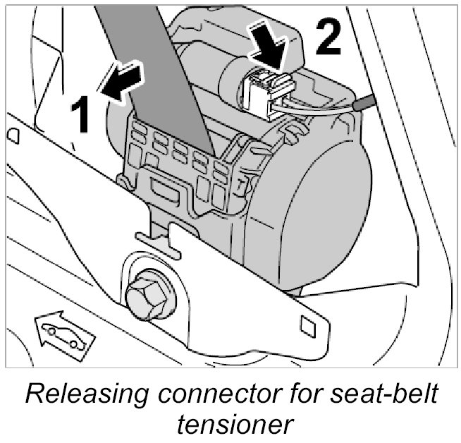 2.1. Release connector -2- on seat-belt tensioner with a screw driver in -direction of arrow-.