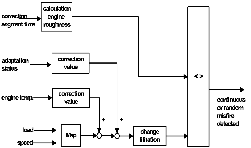 The detection performance is independent of sensor wheel inaccuracies (crankshaft-synchronous segment time fluctuations). However, symmetrical multiple misfires which can also generate crankshaft-synchronous segment time fluctuations cannot be detected. A calculated value is compared to a load and speed dependant threshold. If this threshold is exceeded misfire is detected.
