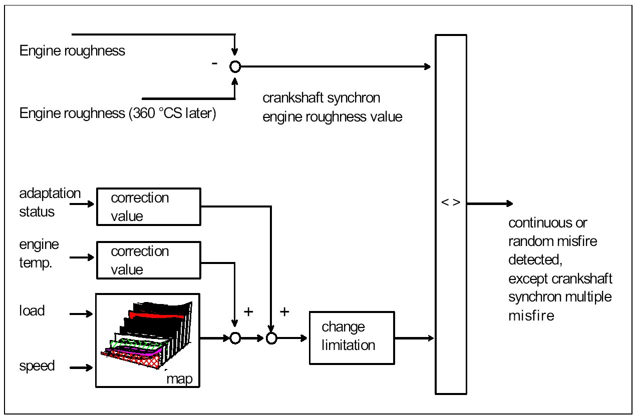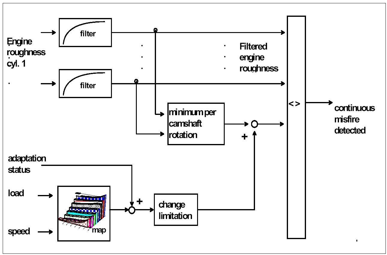 This function allows detection of continuous misfire in one or more cylinders. For this the cylinder-specific engine roughness values are filtered by means of recursive low pass filters and compared to an accompanying threshold / reference value.