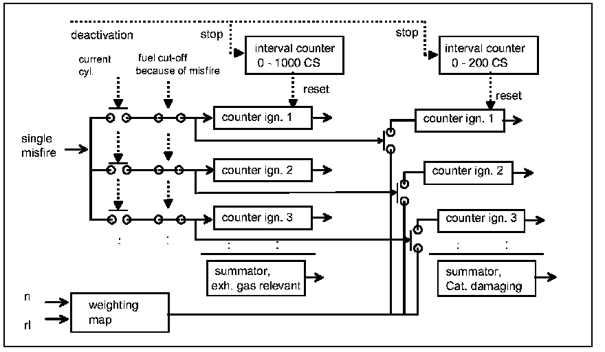 During the fault setting a distinction is made on whether it is an exhaust gas relevant fault (after start or during a driving cycle) or a catalyst damaging fault. Also, an identification of the misfiring cylinder is conducted. With catalyst damaging misfires it is possible to switch off the injector of the affected cylinder to protect the catalyst (up to a maximum of two cylinders). If more than one cylinder misses, then in addition to the cylinder specific fault entry, an additional entry for "multiple misfiring" is set.