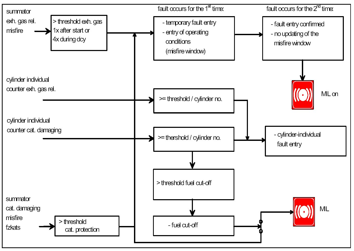 The misfire detection system consists of various sub function, which together guarantee a complete detection of all misfires. Common to all methods is the evaluation of segment durations, which are corrected by means of an adaptation. The misfire detected by each of the individual methods are logically OR the together and then further processed in the fault code management system. The fault code management system determines, among others, when the MIL is to be triggered