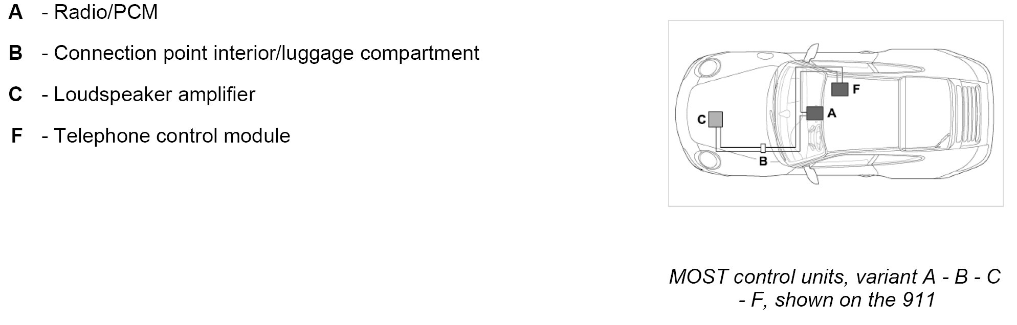 The graphic clarifies the cabling of the individual MOST control units which vary according to their equipment.