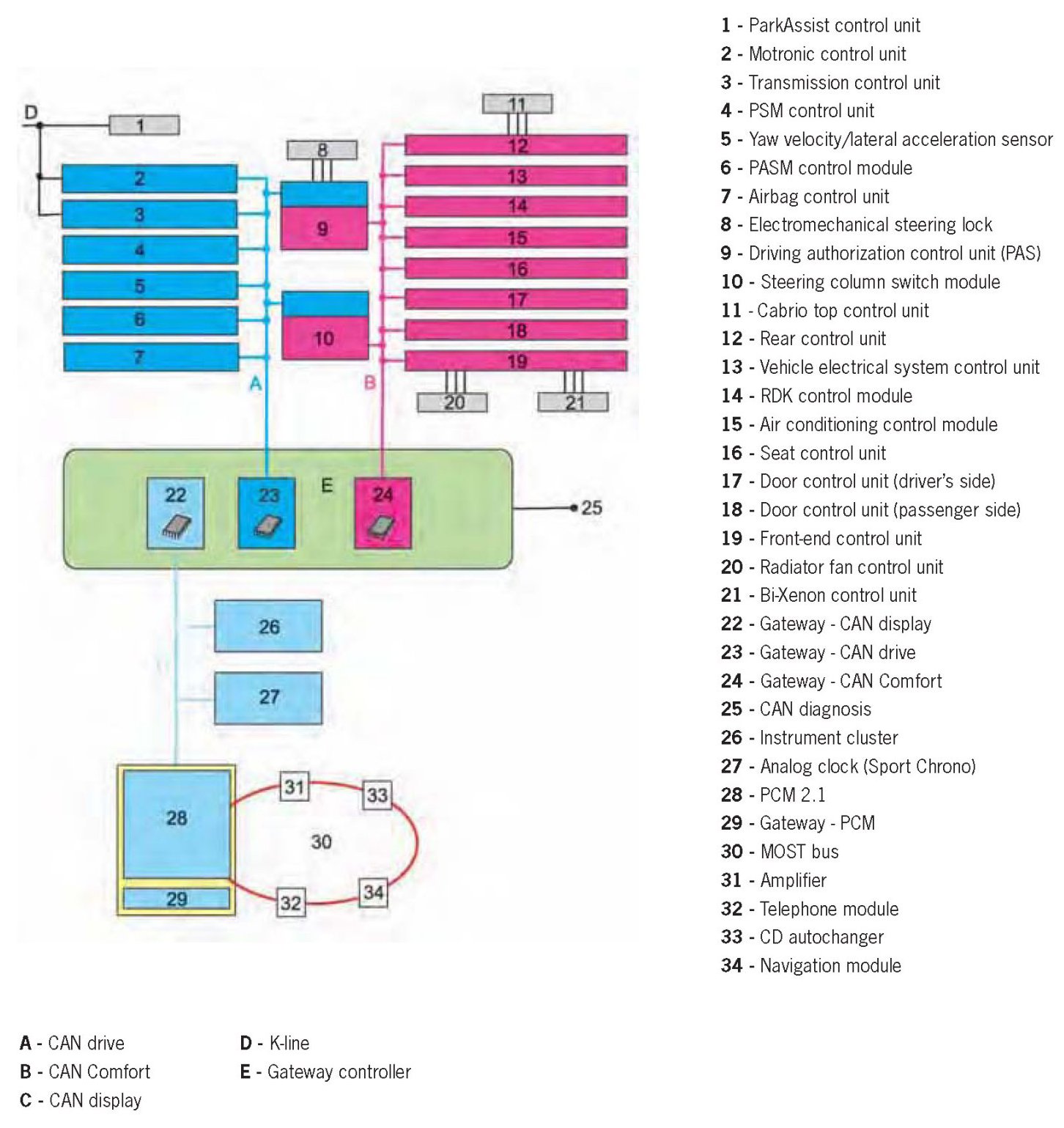 The gateway controller is actively involved with all CAN buses in the Boxster/S (987). The gateway controller is a separate unit, similar to the 911 Carrera (997). It relays all messages and signals which are transmitted by control units for transmission via various buses. The transfer protocol of the gateway controller is defined in a routing table. It also supports the test unit in diagnosing the vehicle by transmitting, collecting and supplying numerous items of information on the vehicle.