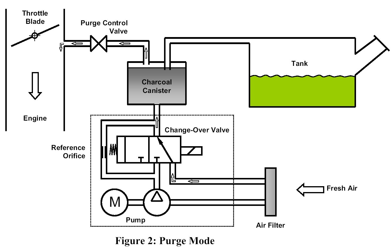 In the Monitoring Mode (Fig. 4) the change-over valve is switched on while the purge control valve remains closed. The motor current drops to a zero-load level. Fresh air is now pumped through the charcoal canister into the tank. A small overpressure, indicated by an increase in the motor current, builds up if the evaporative system is tight.