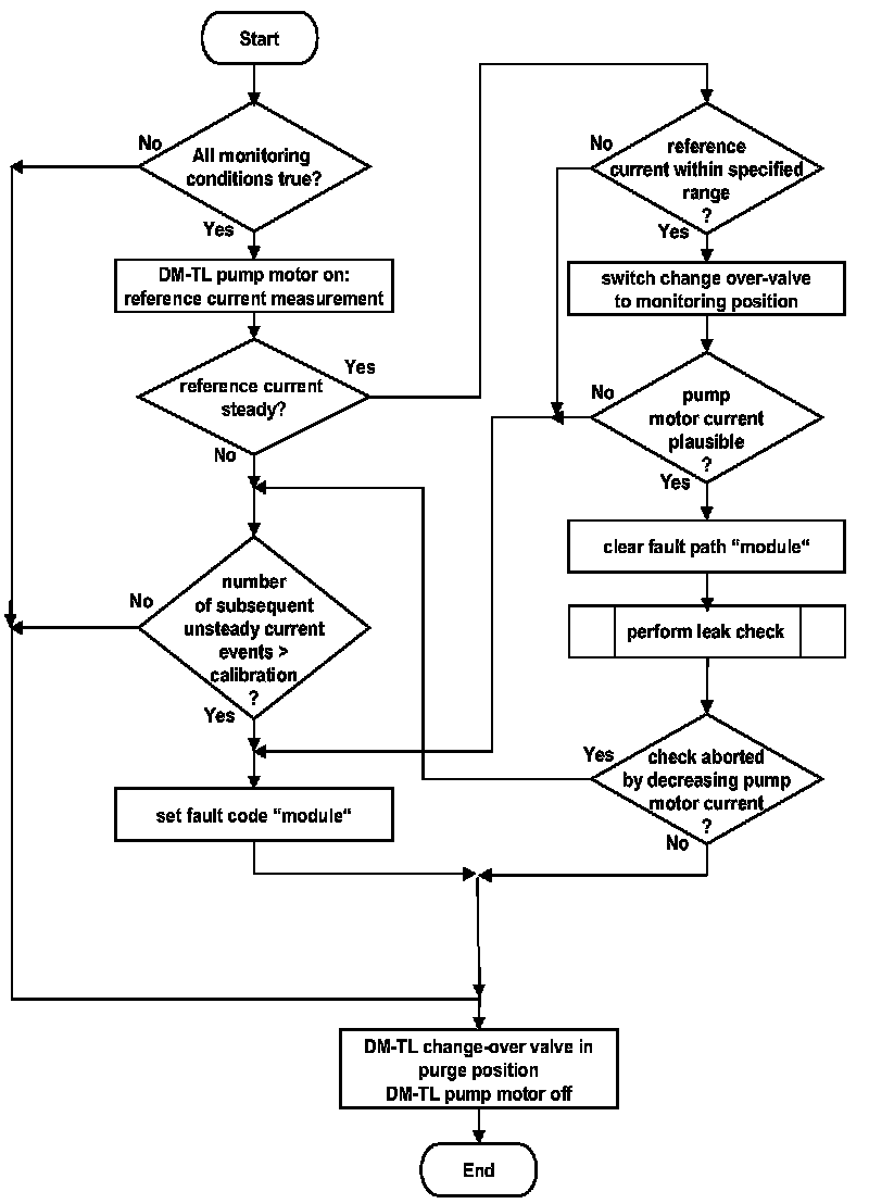 The DM-TL (Diagnostic Module Tank Leakage) is used for monitoring the evaporative system for small (> 0.02 in) and rough (> 0.04 in) leaks. It consists of an electrically driven air pump, a change-over valve and a 0.02 inch orifice for reference measurement - see Fig. 1. The tightness of the tank system is obtained by comparing the actual air pump's motor current with that measured when the system is operated with a standardized reference orifice.