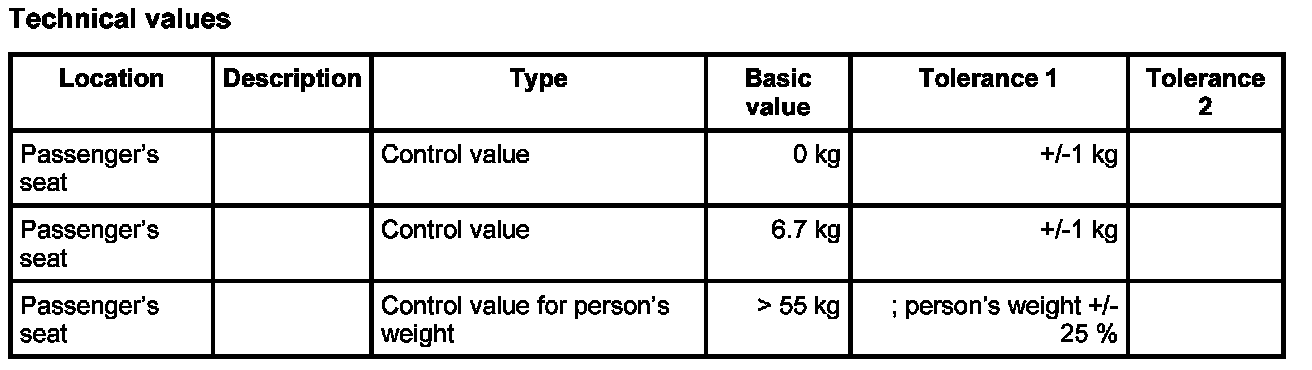 10.1.1. If there is no weight on the passenger's seat, compare values (see table below) using the PIWIS Tester. The Passenger Airbag Off indicator light in the centre console must not come on.