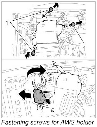 3. Release electric connector on AWS control unit -a-, unplug and tilt the AWS holder to the right side.