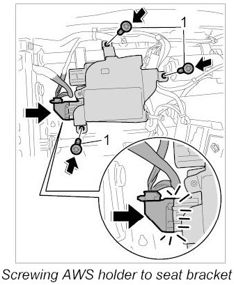 2. Position AWS holder on the seat bracket and screw it down using the three fastening screws -1-.