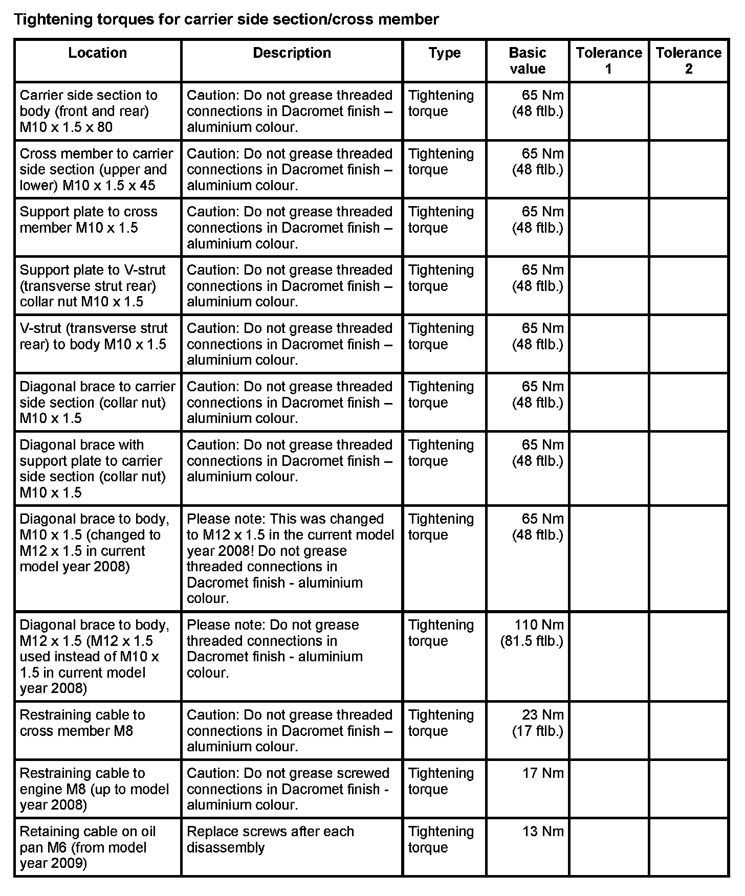 Tightening torques for rear axle