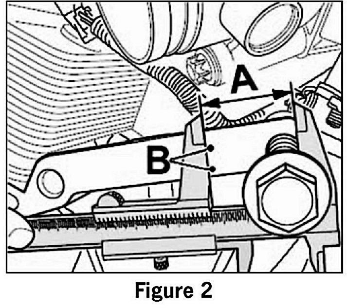 2.3 To identify these crankcases, screw in the fastening screw as shown in Figure 2 and measure the distance between the outside of the fastening screw and the two markings (Figure 2, pos. B) on the crankcase using a caliper gauge (Figure 2, arrow A).