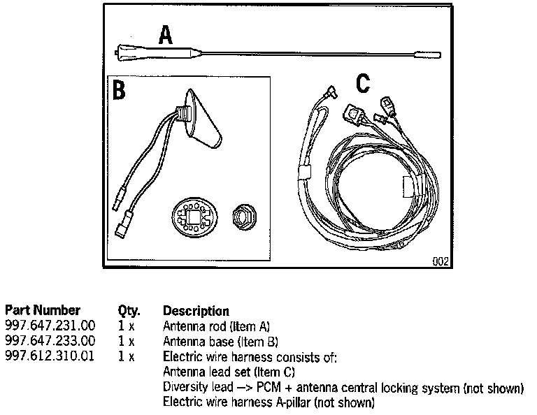Included in the installation set is the standard electric wire harness (roof antenna). For retrofitting, only the antenna lead (HF lead), rod antenna/control unit antenna diversity (antenna diversity CU), and the lead for the rod antenna/PCM power supply are needed. These must be disconnected from the standard wire harness The other leads are not needed.