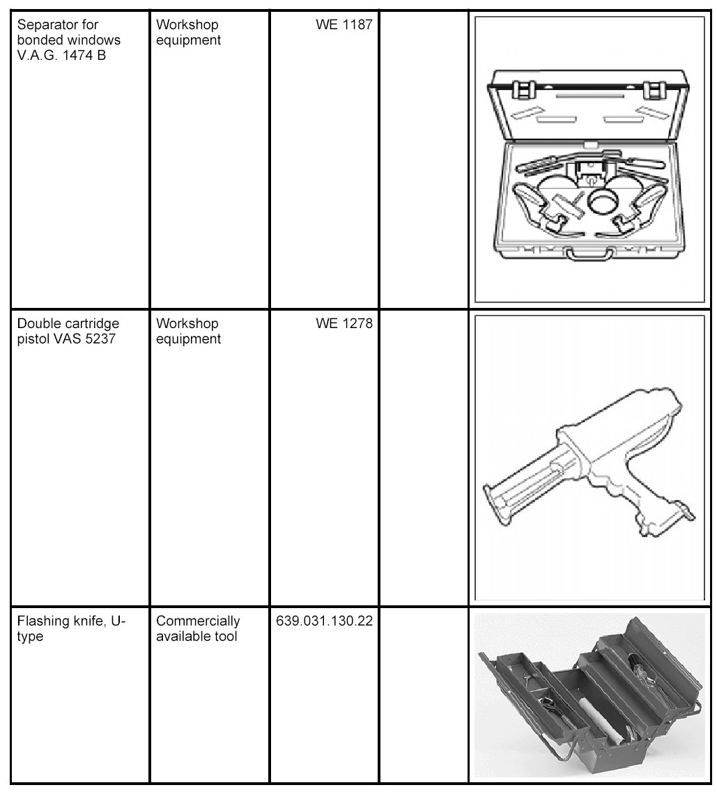 The following tools and materials are required for removing and installing the windscreen with 2-component adhesive: