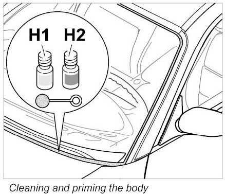 1. Clean areas that are free of adhesive residue or have new paint or where there is damage to the top coat paint in the non-visible area of the window aperture in the body with cleaning solution -H1- and touch up with primers -H2-.
