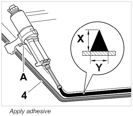1. Using the bonding gun -A-, apply 2-component adhesive to the windscreen along the seal -4- in the form of a triangular bead measuring -X= ca. 15 mm- -Y= ca. 8 mm-.