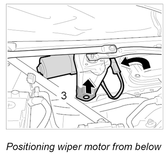 1. Carefully raise the wiper link and position the wiper motor from below.