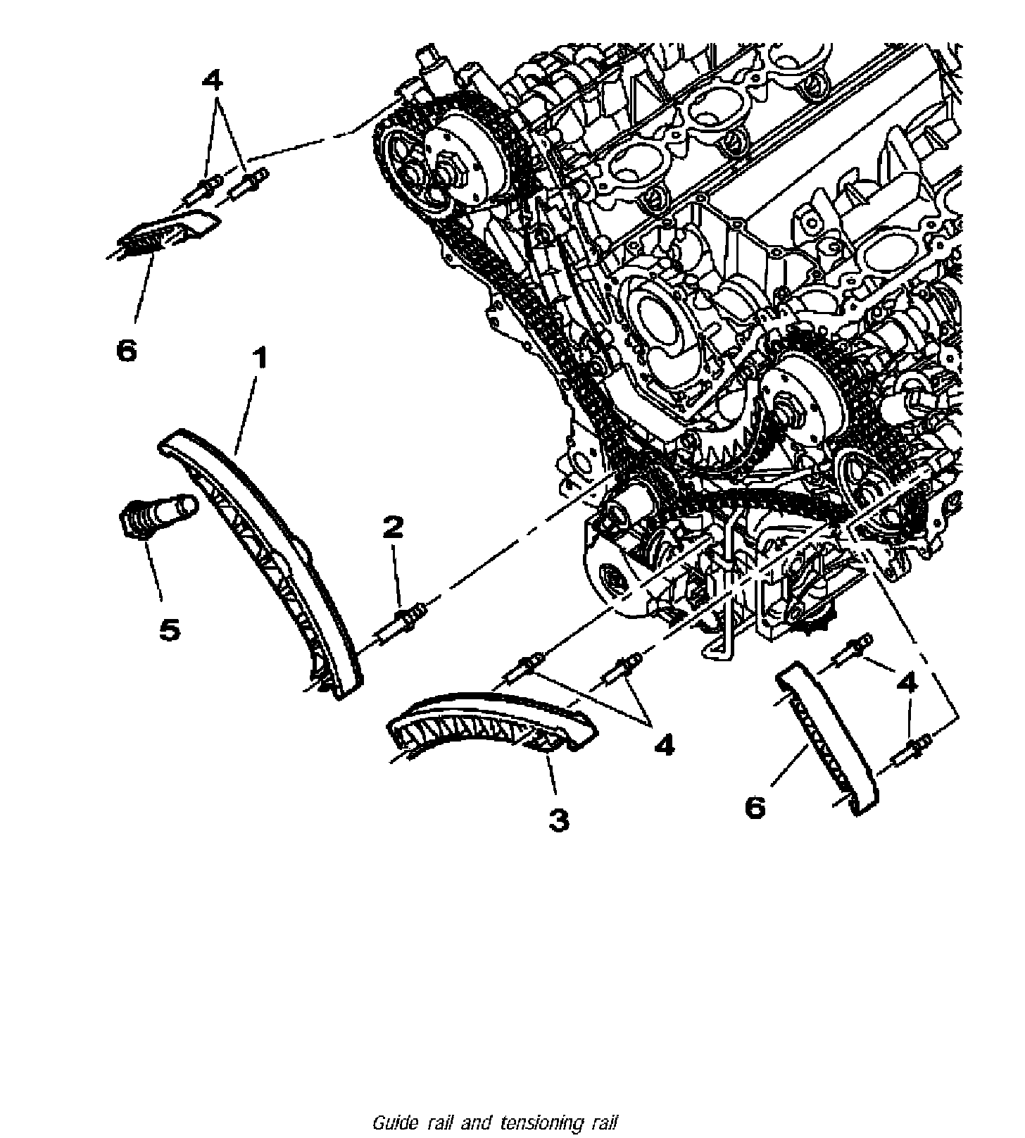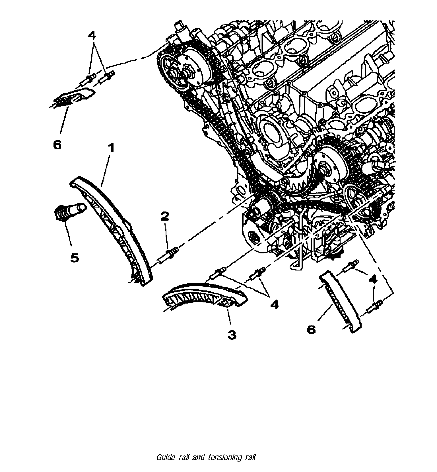 3. Attach guide rail -3- and tensioning rail -1- to threaded pegs. Position the spring of the tensioning rail for oil pump drive correctly on guide rail -3-. Fit top guide rails -6- when installing the timing chains.