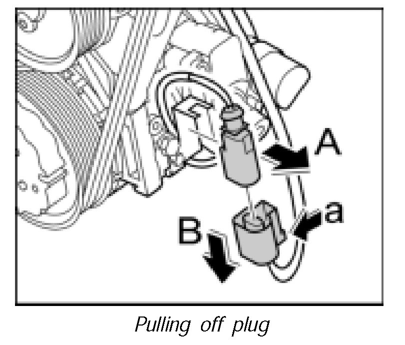 6. Remove the air-conditioning compressor downward and to the left and turn the air-conditioning compressor.