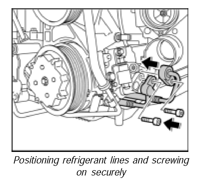 10. Position refrigerant lines and screw on securely. Tightening torque 15 ftlb.