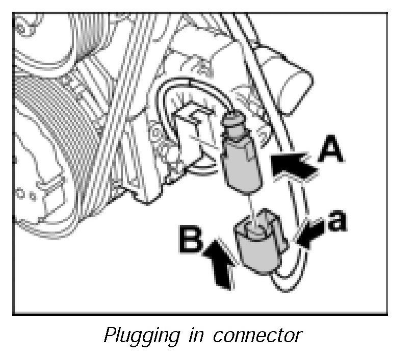 11. Push on connector -arrow B-, until lug -arrow a-clicks into place and insert into the support on the compressor -arrow A-.