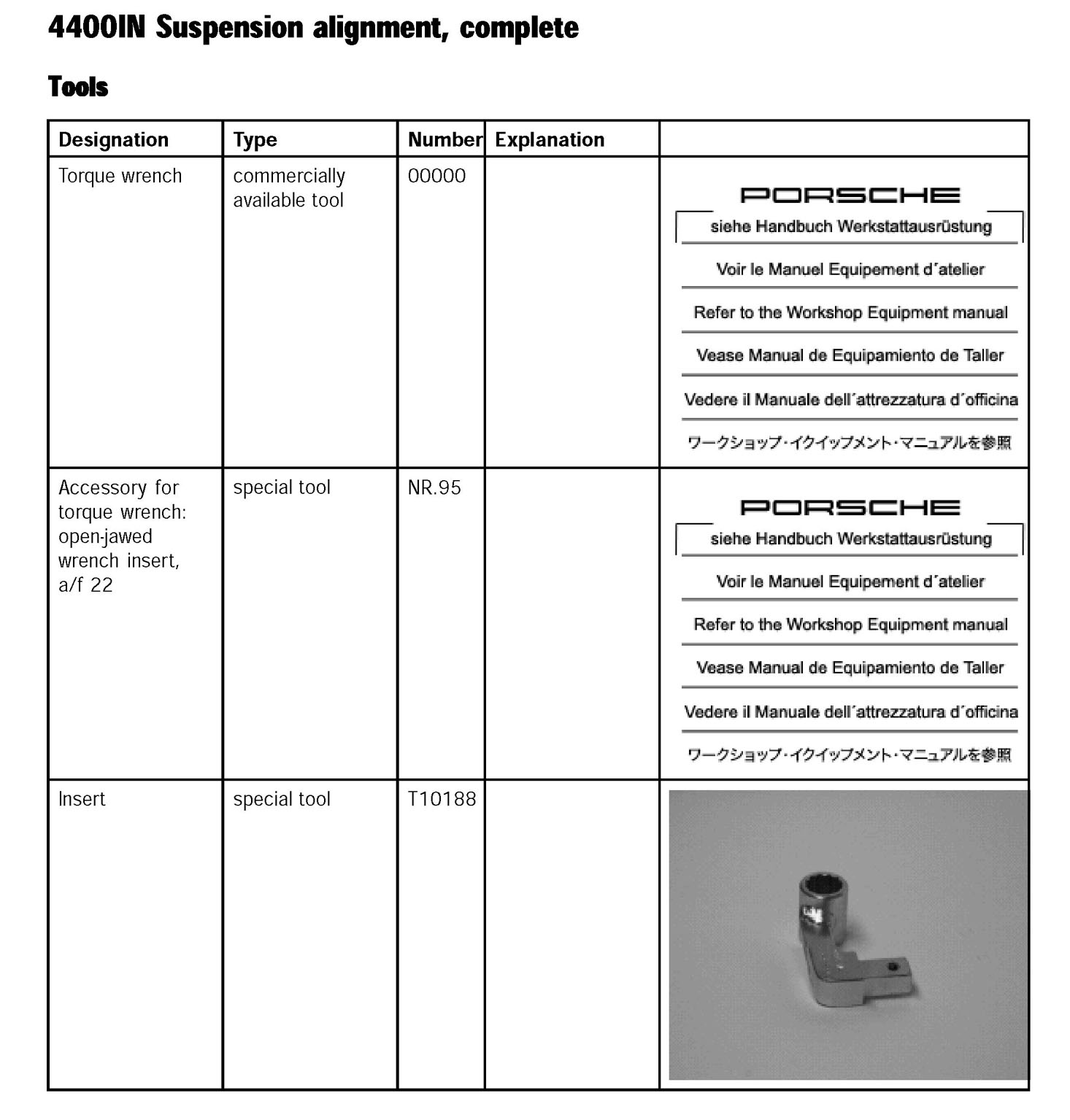 ^ B- - Insert for dynamometric key: Insert T10188 - used to tighten the lock nuts of the camber and caster eccentrics at the front axle to the specified tightening torque' 4000TW Tightening torques for front axle ', section on Trailing arm. Can also be used for loosening.