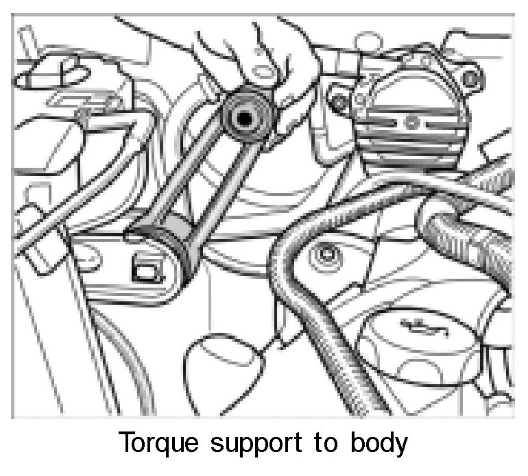 13. Install bracket for torque support. The M8 x 45 Torx screws are tightened on the upper screw points. Tightening torque 17 ft.lb.The M6 x 40 screws are tightened on the lower screw fastening points (centre of the valve cover) Initial tightening 3.5 ft.lb. Final tightening 7.5 ft.lb.