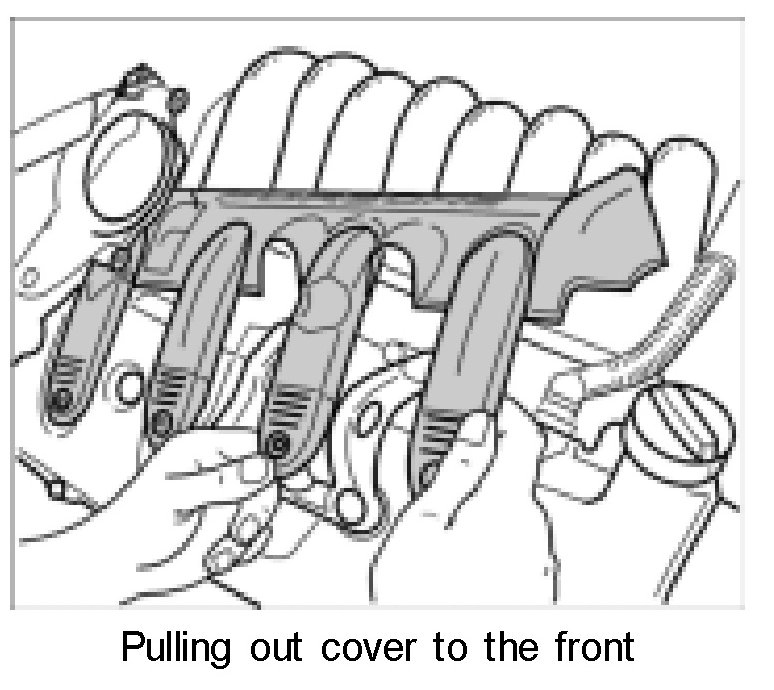 6. Lift the cover at the front edge and slide the ignition coil cover of the second cylinder out of the torque support bracket. Pull out cover to the front.