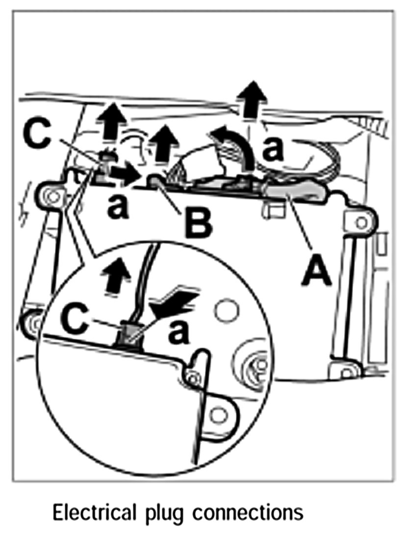 3. Press latch on the electrical plug -A- and open the locking lever -a- , remove plug.