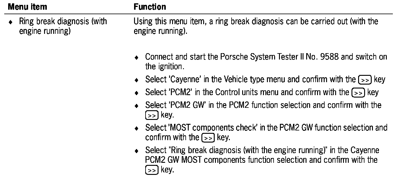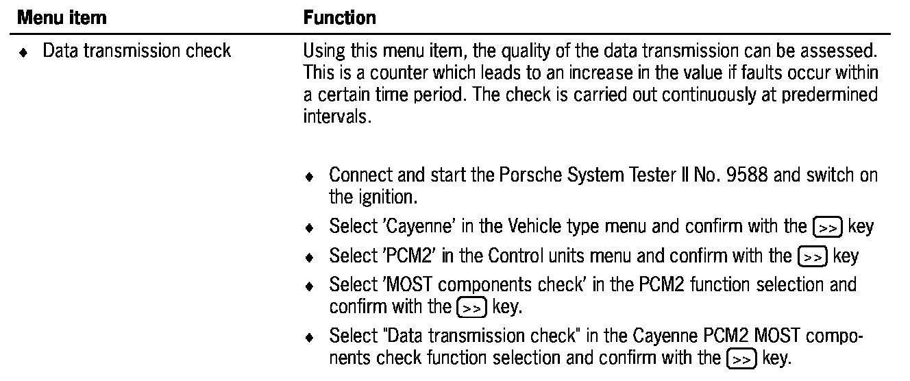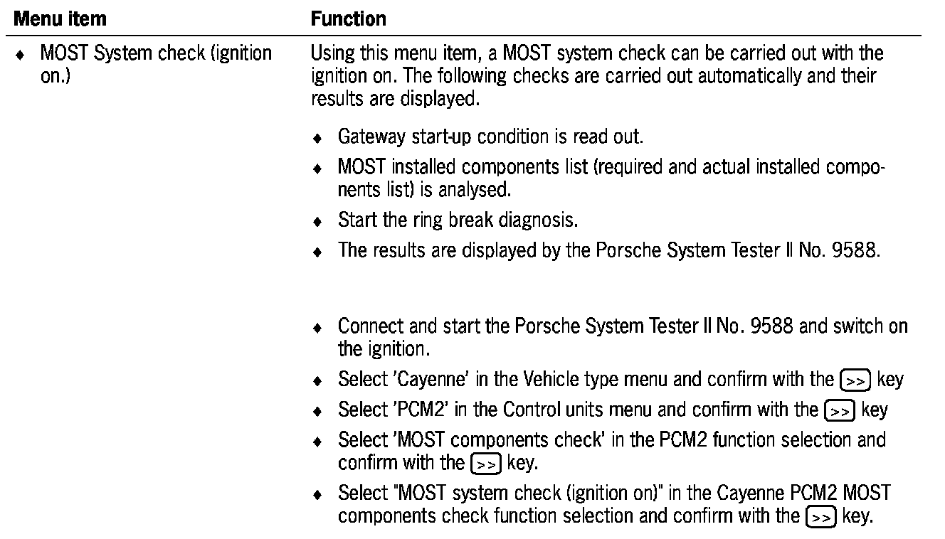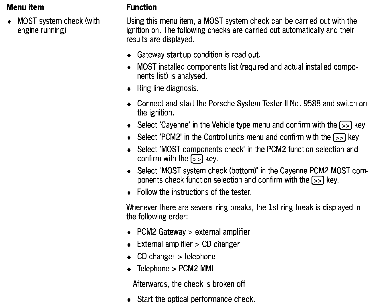 The MOST component check can be reached via the menu PCM2 function selection. This comprises a summary of the following check processes: