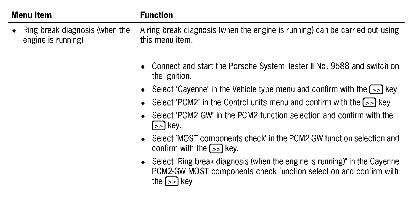 Communication between the Porsche System Tester II No. 9588 and the MOST control modules only takes place via the K lead to the instrument cluster. The data is transferred from the instrument cluster gateway to the MOST control modules via CAN Infotainment to the PCM2 gateway, via the electrical MOST in the PCM2 and via the optical MOST outside of the PCM2.