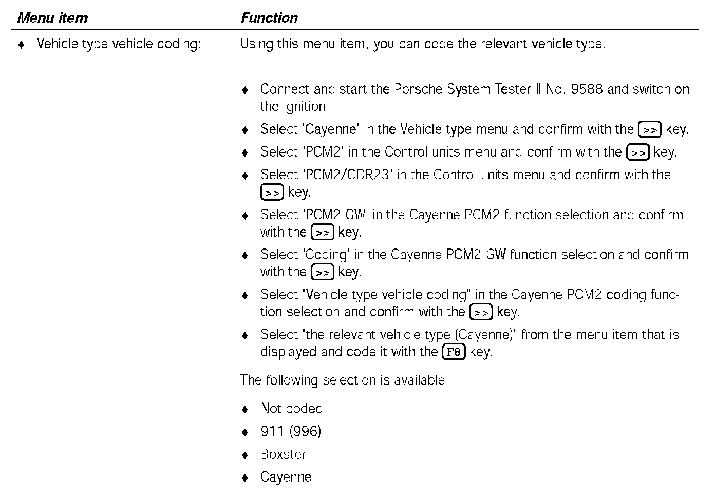 5. Select 'PCM2 GW' in the Cayenne PCM2/CDR23 function selection menu and confirm with the [>>] key.