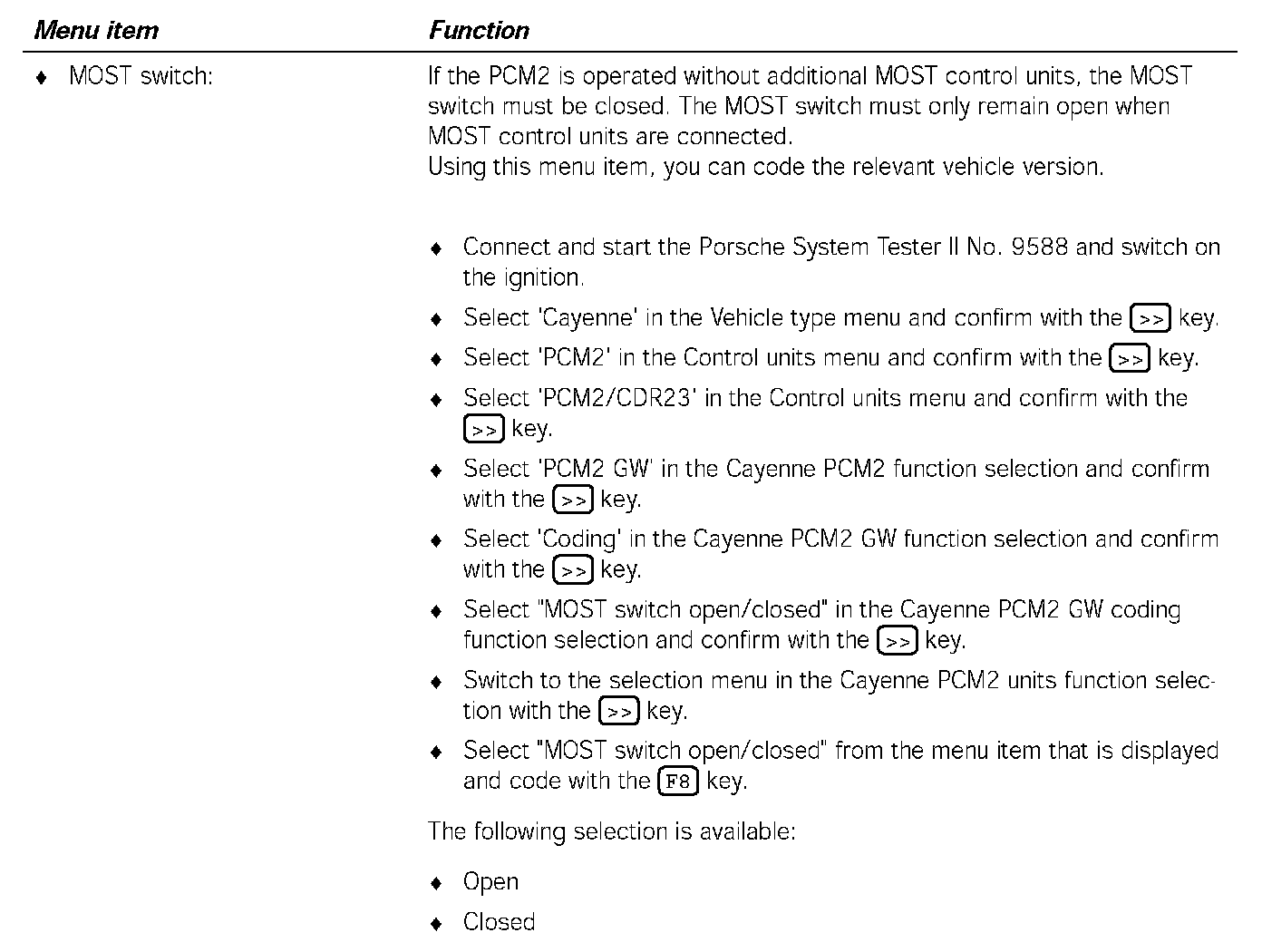- When the 'Switch closed' parameter is set, the switch remains closed even in existing MOST control units. Communication is then not possible.