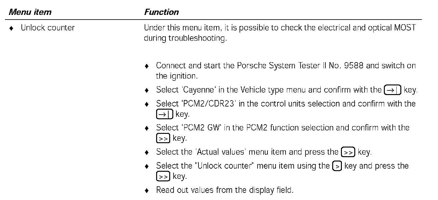 Communication between the Porsche System Tester II No. 9588 and the MOST control units only takes place via the K lead to the instrument cluster. The data is transferred from the instrument cluster gateway to the MOST control units, via CAN Comfort to the PCM2 gateway, via the electrical MOST in the PCM2 and via the optical MOST outside of the PCM2.