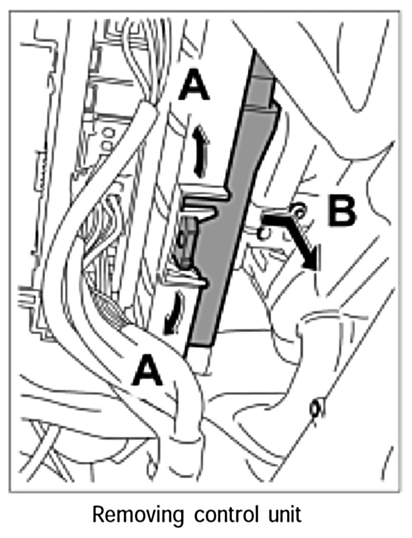 1. Push the two locking tabs apart -arrows A-. Pull the control unit to the right and downwards -arrow B-.
