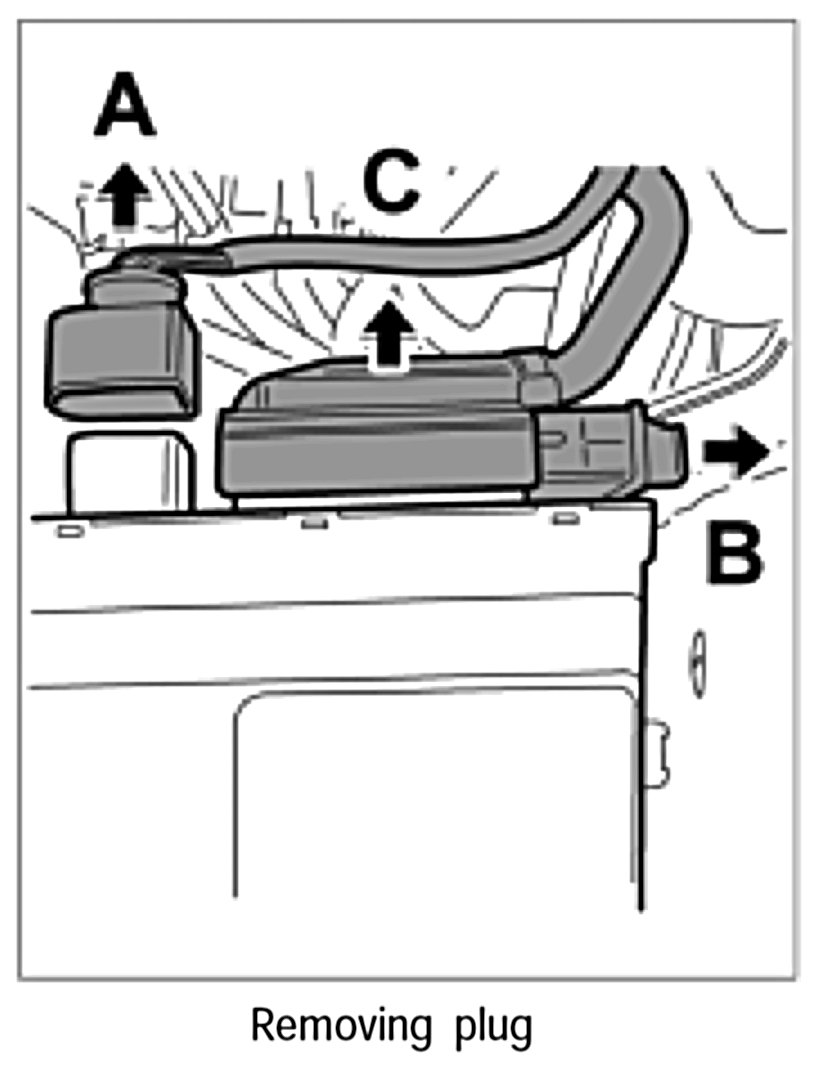 2. Press and pull off plug -arrow A-. Open lock -arrow B- on plug -arrow C- and remove plug.