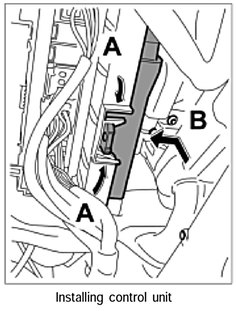 3. Insert control unit into the upper mounting point -arrow B- and engage in holder -arrows A-.