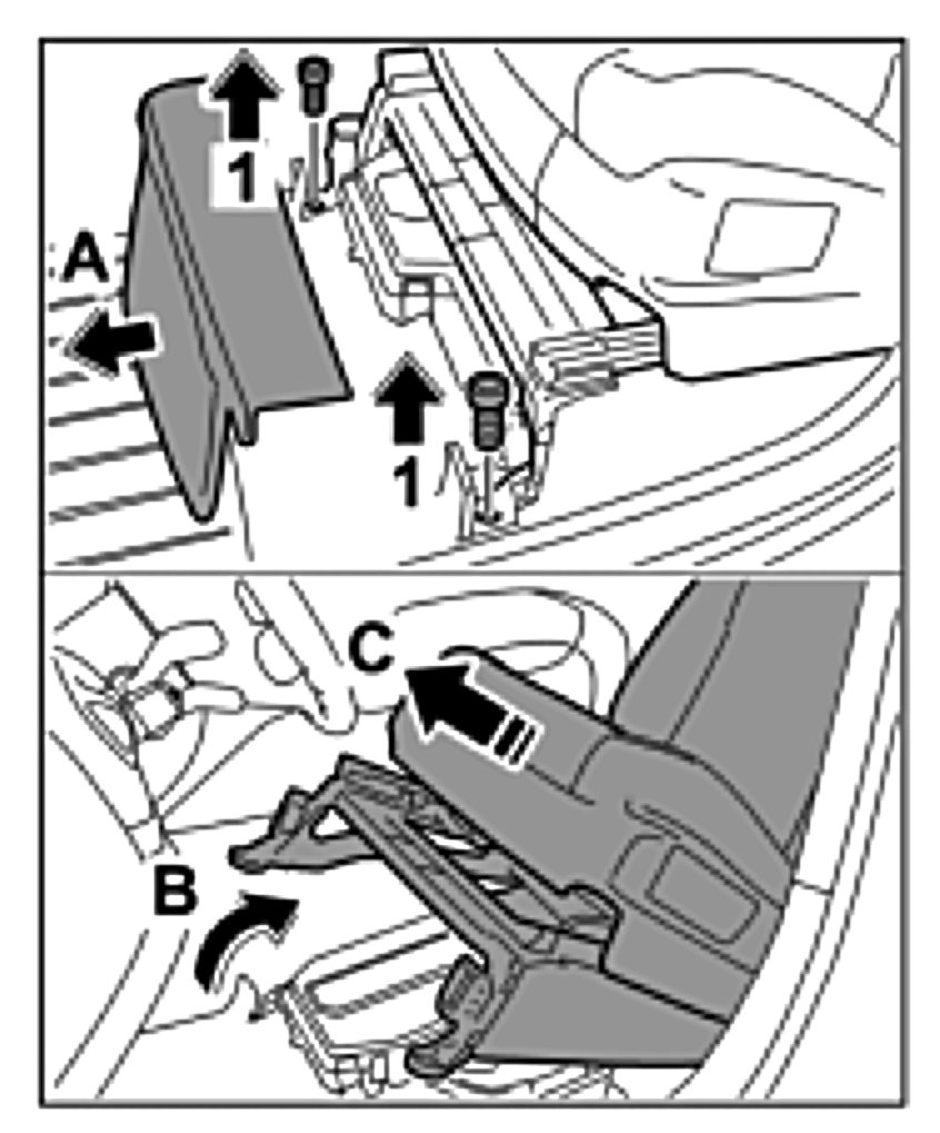 3. Fold the carpet sections forward and remove the two fastening screws -1-.