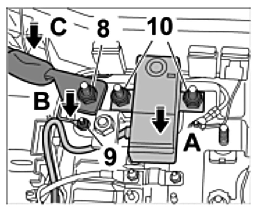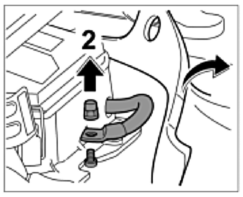 8. Unscrew fastening nut -3- and remove line for auxiliary battery -Arrow C-.